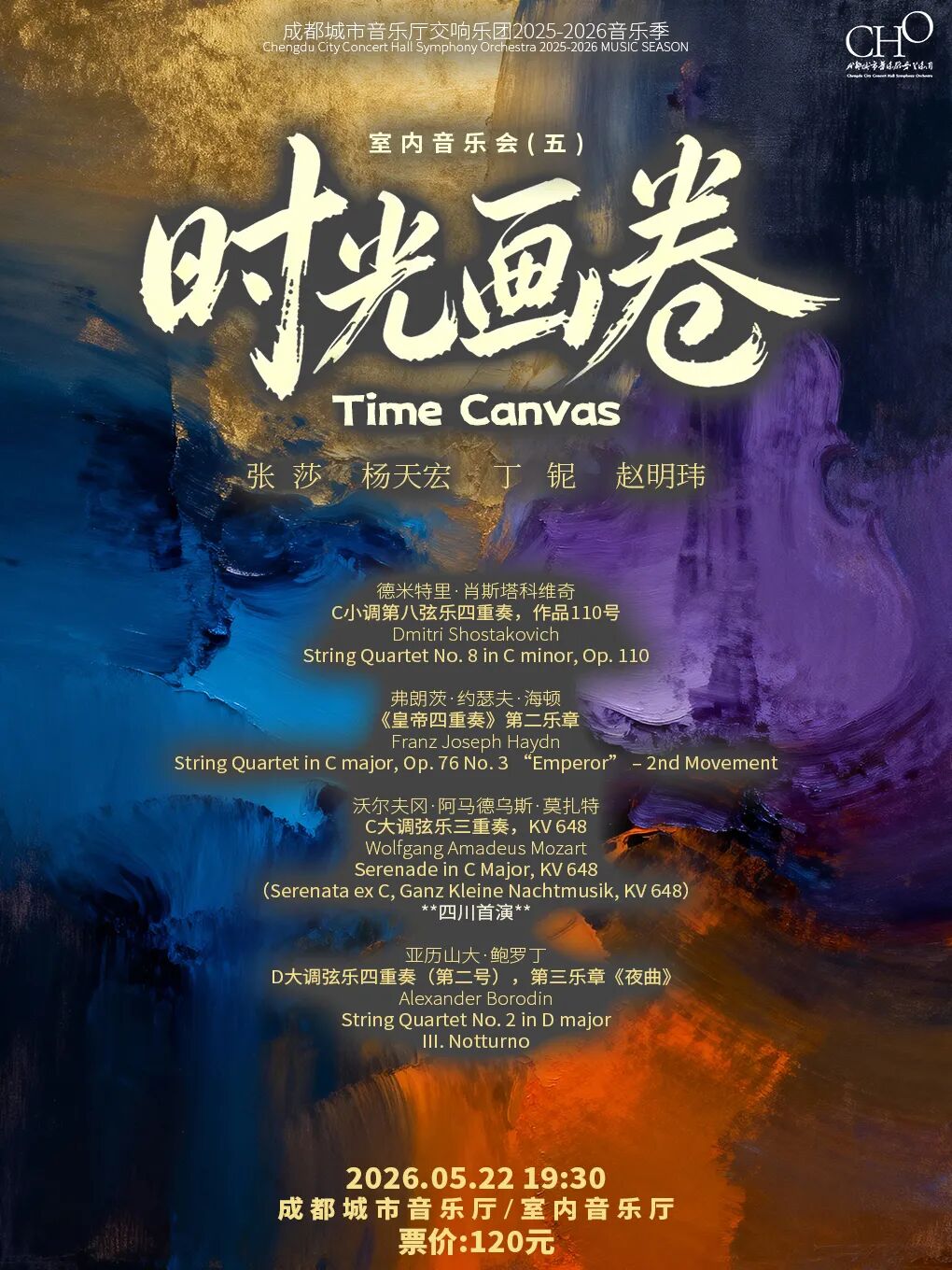 2026年5月22日,成都城市音乐厅交响乐团「时光画卷」室内音乐会,将以四首跨越两百余年的杰作,以弦乐四重奏的形式,为你铺展一幅写满时代印记的音乐长卷。