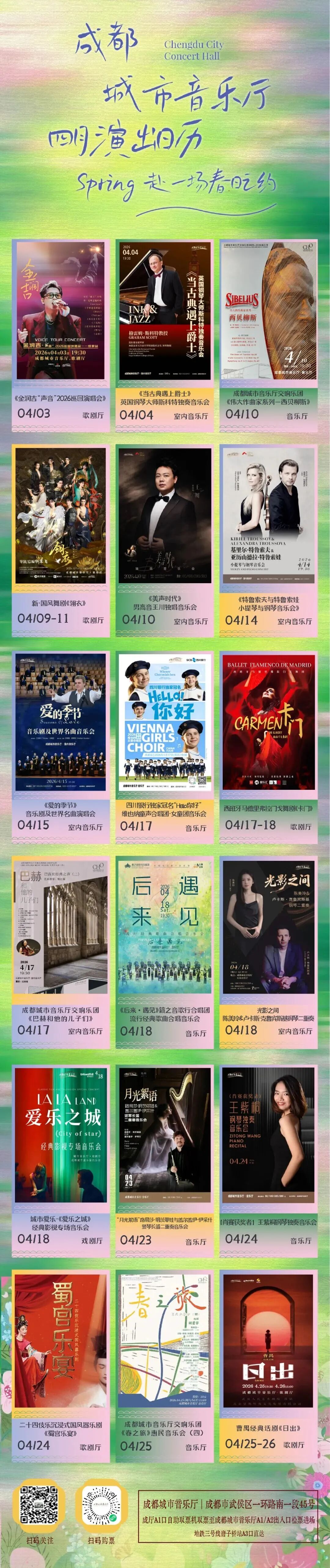 5、成都城市音乐厅公众号购买:请持取票信息(短信取票码)于成都市武侯区一环路南一段45号成都城市音乐厅A1口自助取票机取票至成都城市音乐厅A1/A2出入口检票进场。