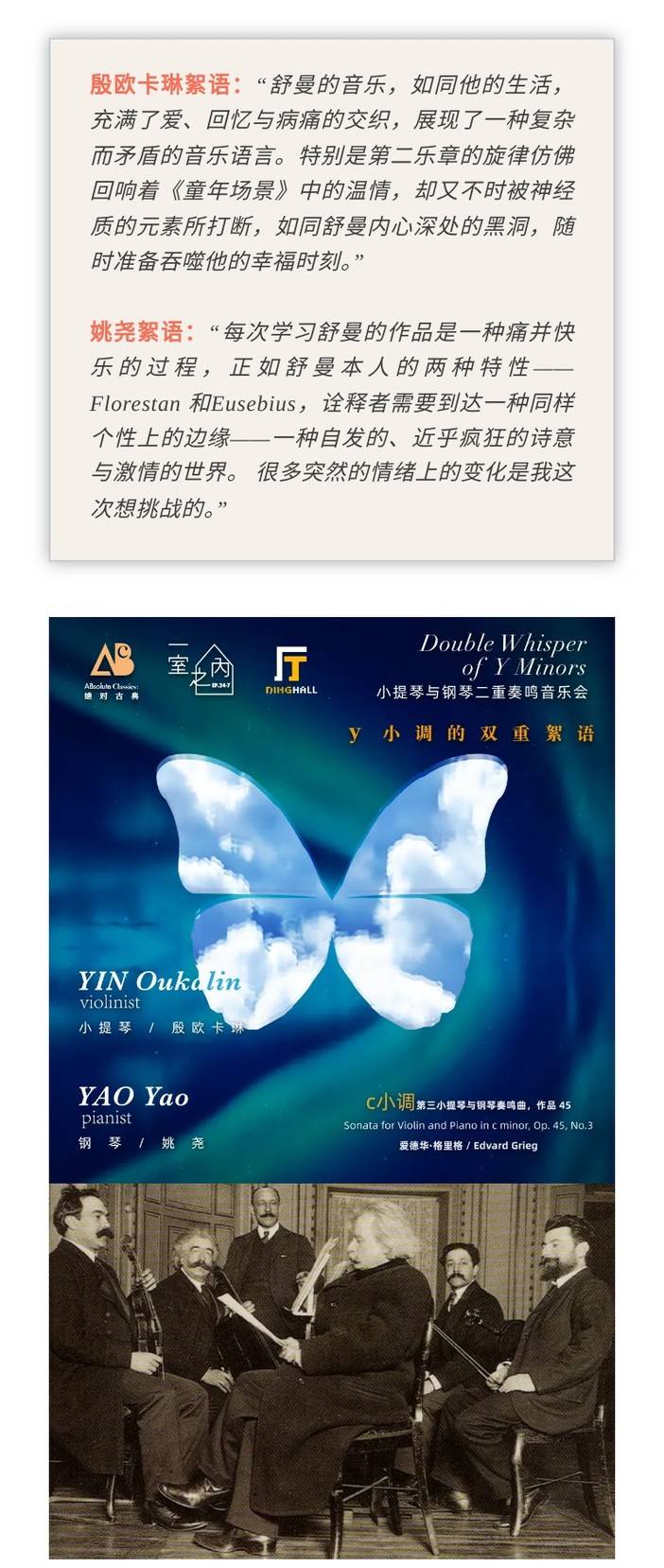 作为一个小小巧合,三首情调各异的“小调作品”,又由两位名字首字母均为“Y”(姚尧&殷欧卡琳)的青年音乐家演绎,故我们将这场音乐会命名为“y小调的双重絮语”。从选曲创意、到海报设计、到后续将发布的program notes(音乐会笔记)、到现场演绎,这样的“双重絮语”都会贯彻始终——