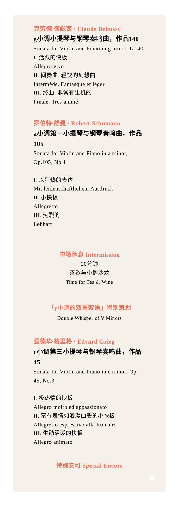 本场音乐会,两位好友以展现小提琴与钢琴“二重奏鸣”的魅力作为初衷和发心,精心选择,为蓉城听众们献上三首聚焦19世纪晚期-20世纪早期的欧洲经典小提琴与钢琴奏鸣曲作品,分别来自法国作曲家德彪西g小调小提琴与钢琴奏鸣曲(1917年)、德国作曲家舒曼a小调第一小提琴与钢琴奏鸣曲(1851年)和挪威作曲家格里格c小调第三小提琴与钢琴奏鸣曲(1887年)。
