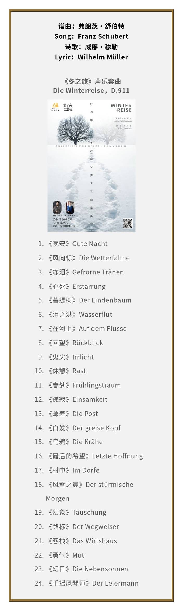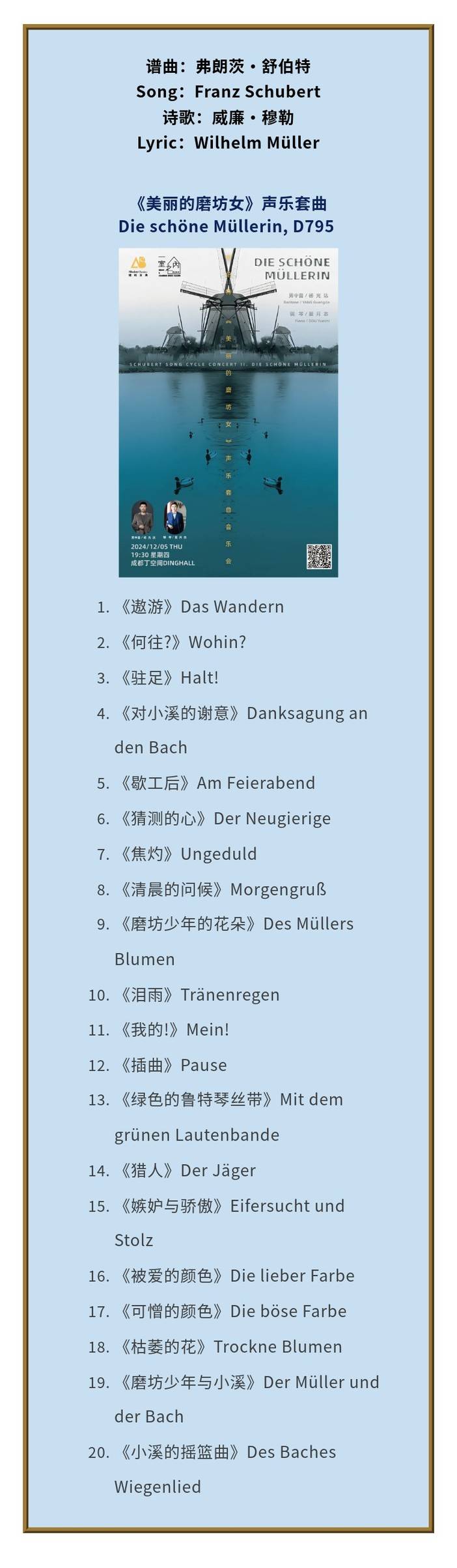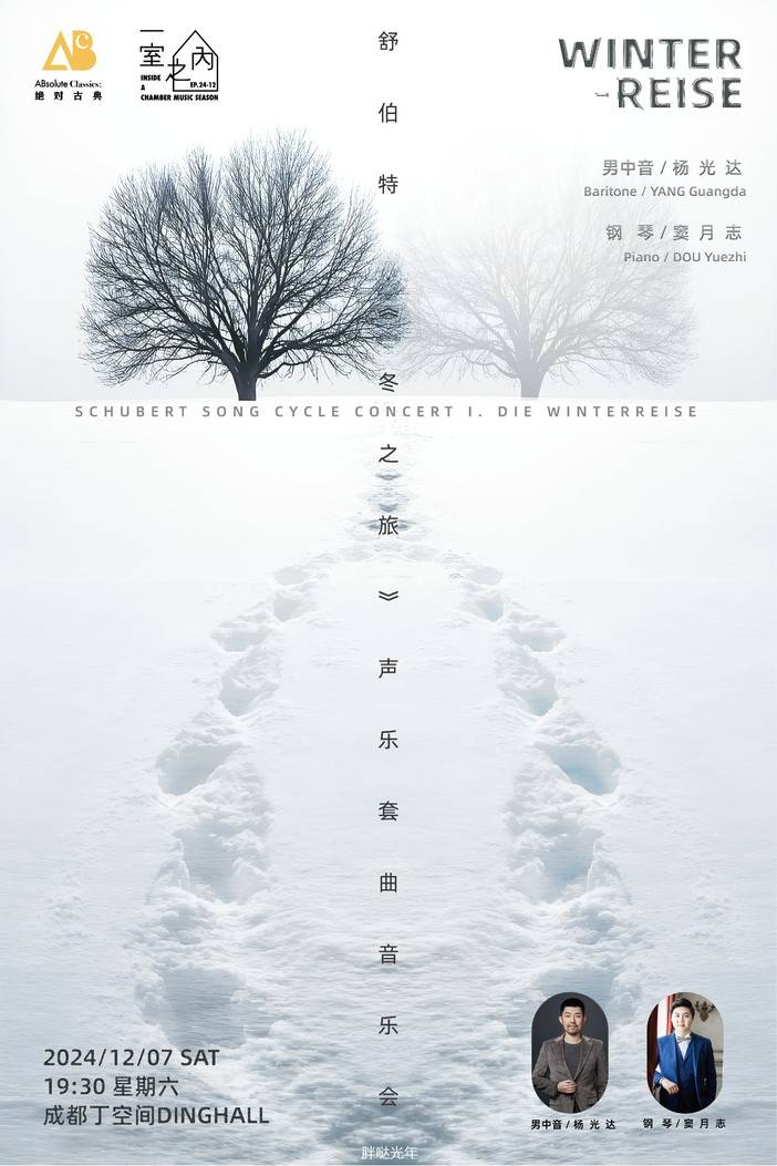 2024年12月5/7日,绝对古典「一室之内」乐季的舞台将首次迎来声乐室内乐的演出。我们有幸邀请到青年男中音演唱家杨光达和青年钢琴家窦月志,为冬日蓉城献上两部冬日限定的声乐巨作,同时也是德奥艺术歌曲宝库中最为璀璨夺目的明珠——由奥地利浪漫主义作曲家弗朗兹·舒伯特为德国诗人威廉·穆勒诗作谱曲而成的声乐套曲《美丽的磨坊女》(1823)与《冬之旅》(1827)。
