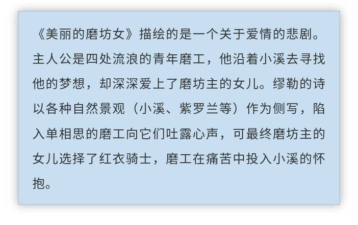 也许是穆勒的祈祷被听见了,两个“同声同气的灵魂”,真的隔空相遇了。1822年,25岁的舒伯特身体健康情况变得极为糟糕,到了1823年,更是经历自己过去四年在歌剧创作上的不顺利,可谓身心俱疲 ——“我想歌唱爱,爱却转为苦痛;我想歌唱苦痛,苦痛却变成爱。”他在自己的手稿集中如是写道。某日,寻找灵感的舒伯特偶然间翻开了威廉·缪勒的诗集《一个林中漫游号手的遗诗》(Sieben und Siebzig Gedichte aus den hinterlassenen Papieren eines reisenden Waldhornisten),并立即被其中浪漫而苦涩、朴实又精美的诗歌所吸引。他从已发表的25首诗歌中挑选了20首,谱写成为男高音而作的声乐套曲《美丽的磨坊女》(Die schöne Müllerin)。