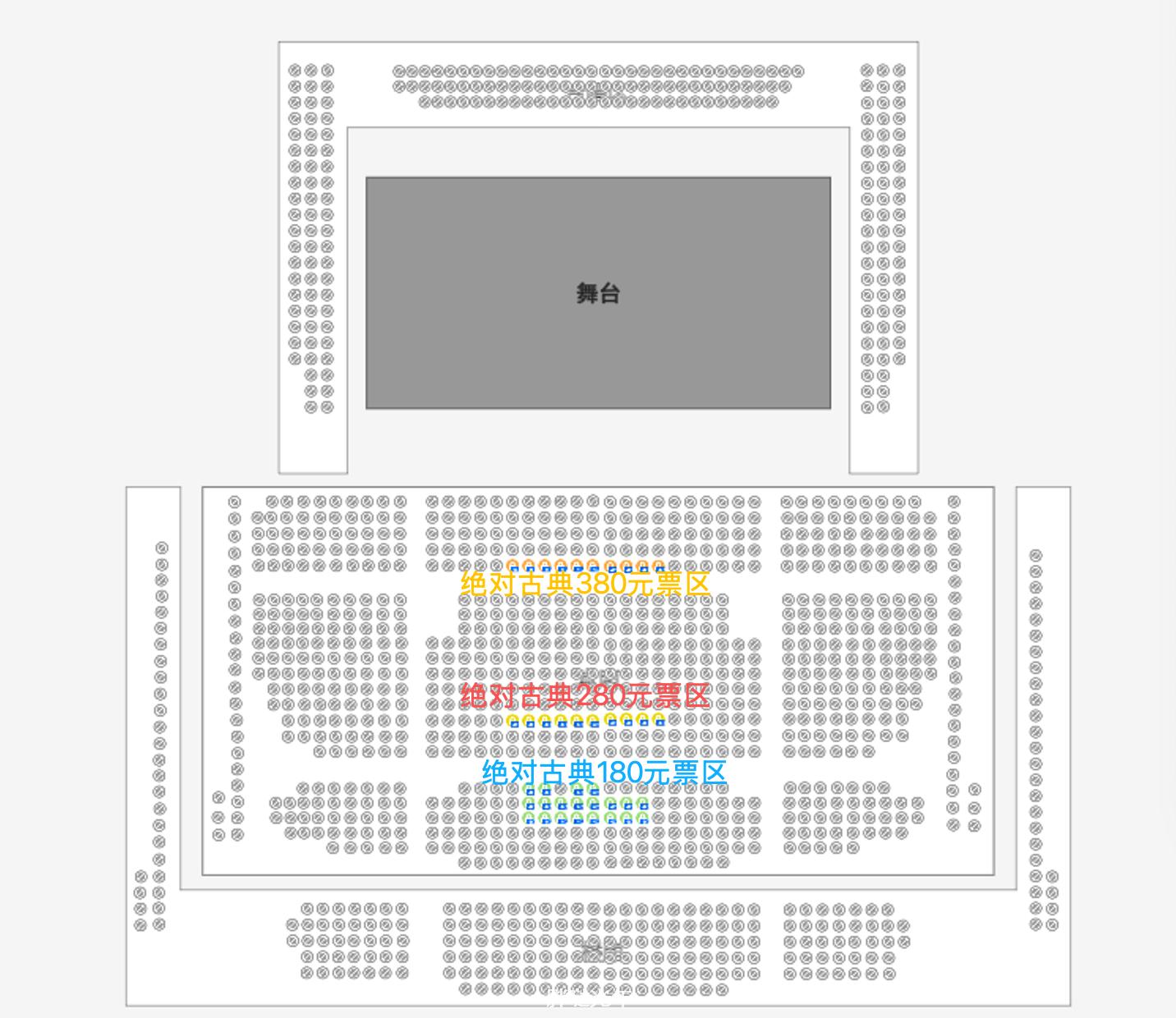 1、绝对古典团票位置如图(框内座位):按照购票付款顺序,从左往右,从前往后,依次排列分票