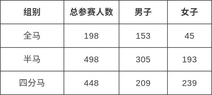 本次赛事共设立五个组别,全程马拉松组(42.195km)、半程马拉松组(21.0975km)、四分马组别(10km)、薛城欢乐跑组(3km)和本地建党百周年组(3km),其中竞赛组别参与人数数据如下: